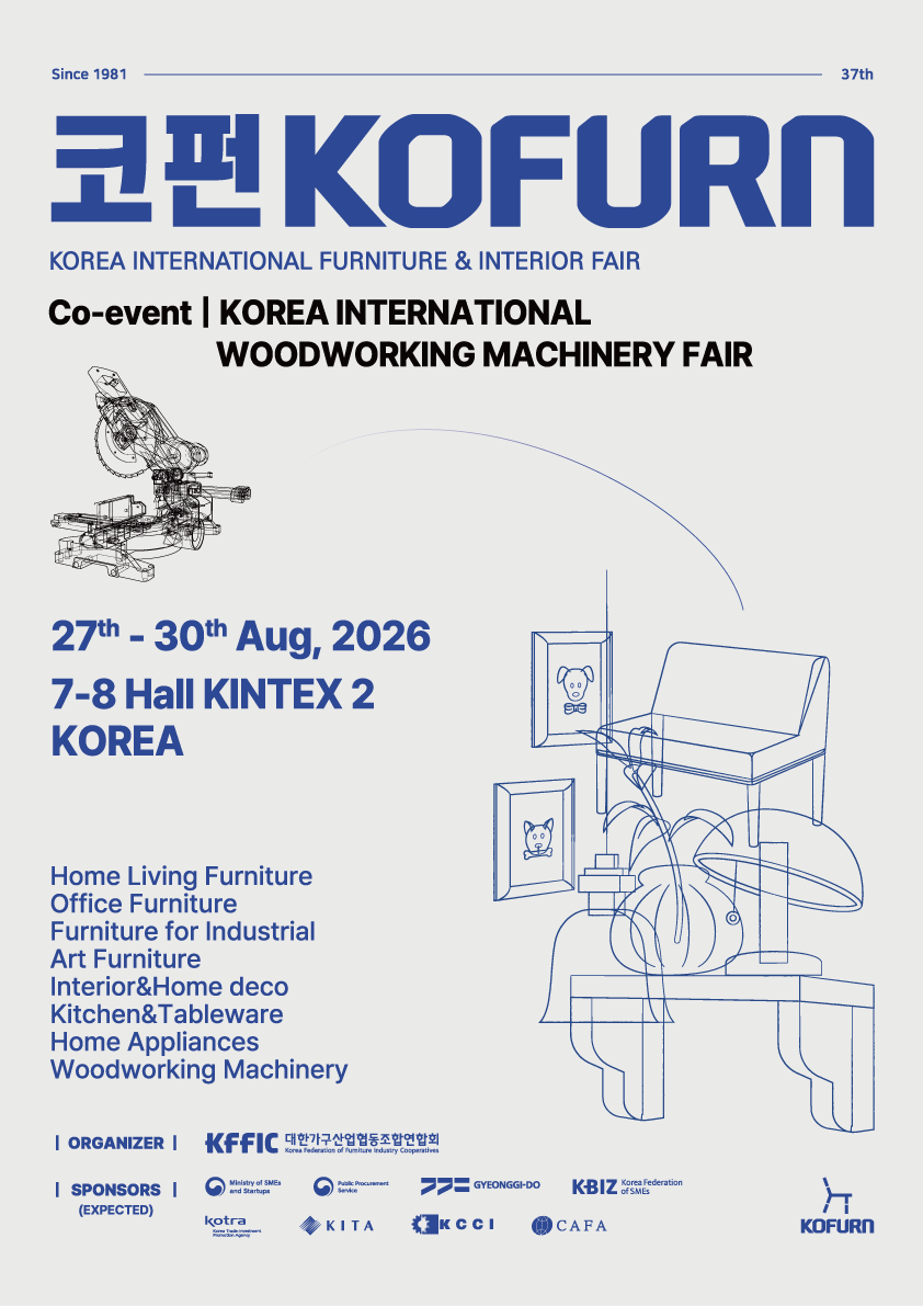 Korea International Furniture & Interior Fair [KOFURN] have been organized since 1981 with start of “National Best Furniture Fair” and “International Wood Working Machinery Fair on 1982. To foster trade in goods industry, KOFURN had been held bienninally from 1984 to 2002. From 2003, KOFURN has been organized annually and we had the 37th anniversary in 2026. KOFURN is organized by KFFIC[Korea Federation of Furniture Industry Cooperatives] which is an affiliated non profit organization under Ministry of SMEs and Starups, endorsed by many government organizations & related institutions such as Ministry of Trade, Industry and Energy [MOTIE], Gyeonggi Province, Korea international Trade Association [KITA], and Korea Trade Investment Promotion Agency[KOTRA] to lead active participation, launch new products, automatize production line, and develop design.